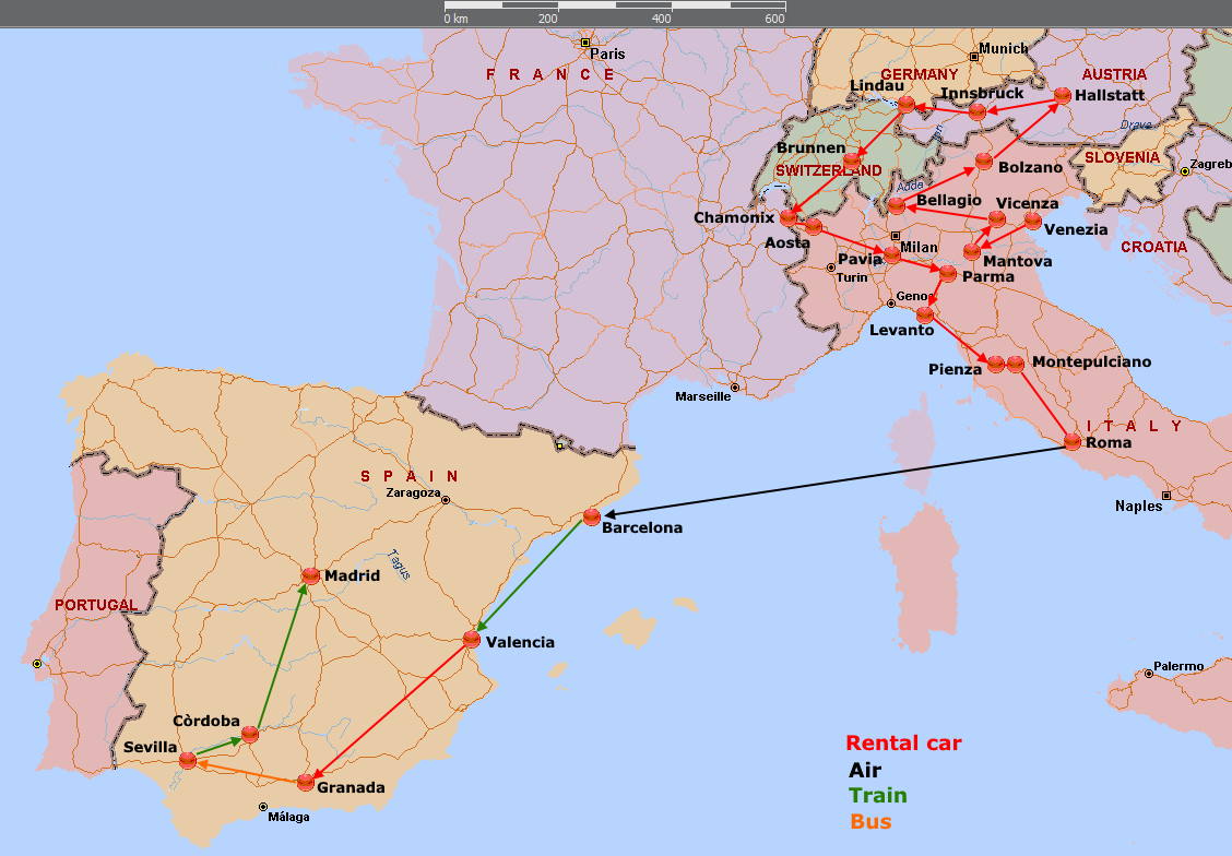 During July to October 2009, we spent 12 weeks touring around Europe: Italy, Austria, Germany, Switzerland, France, and Spain. The map below shows our route around these cpuntries (click on the map for a larger version). If you would like to join our adventure, you can either follow this site or, for more words and fewer pictures, look at Lynn's blog. If you want to stay here, let's go to North-East Italy.