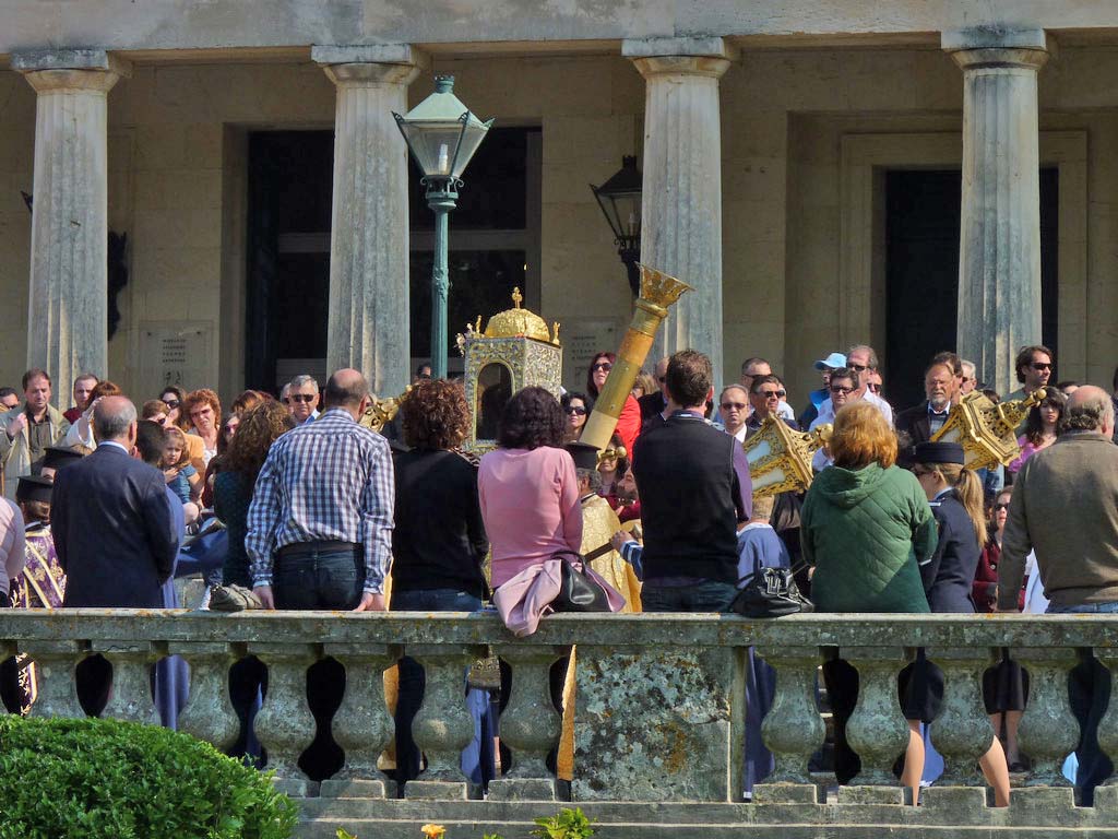 We went into Corfu Town on Easter Saturday morning for the Easter procession and pot throwing. We had to park at the port and take a free bus into the town. We did not see much of the procession: mainly just other spectators. † |