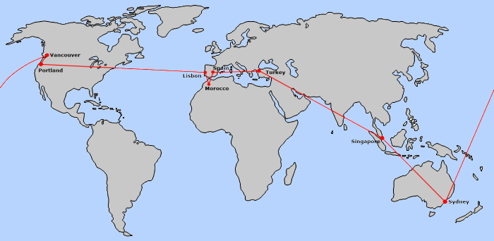Between August and October 2012, we went on a journey visiting four continents: Asia (Singapore and Turkey), Europe (Turkey, Spain and Portugal), Africa (Morocco), and North America (USA and Canada). The map shows where we went: click on it for a larger version. Let's set off now for Singapore or, if you prefer fewer photos and more words, see Lynn's blog.