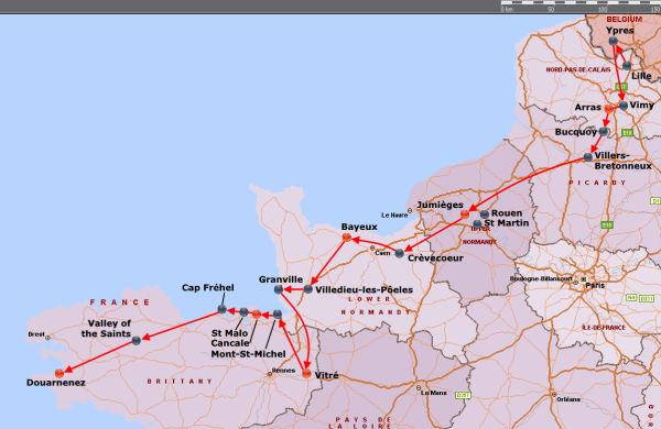From Brugge, we took an almost empty train to Lille, where we picked up a rental car and started our tour around France. The first part took us from Pas-de-Calais, through Normandy and into Brittany. Click on the map to see a larger version, with place names. The red blobs are places where we stayed, and the black blobs are other places visited. We start by going to Arras.