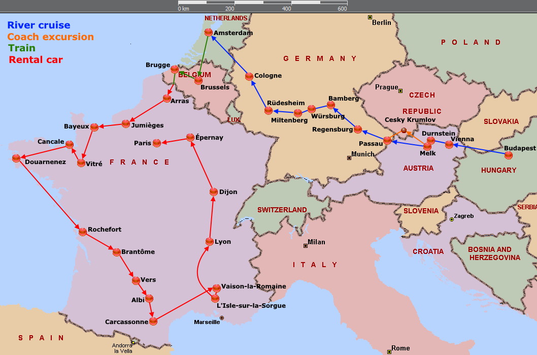 On Easter Monday 2014, we set off on a holiday a bit different from our previous adventures, in that a fortnight was going to be on a river cruise from Budapest to Amsterdam. This would be our first cruise, and we were looking forward to it. Afterwards, we would travel by train in Belgium and then rent a car for a month of travel around France. This is what the holiday looked like.