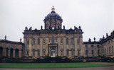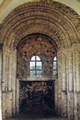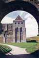 Castle Rising Castle seen through the ruins of its gatehouse.