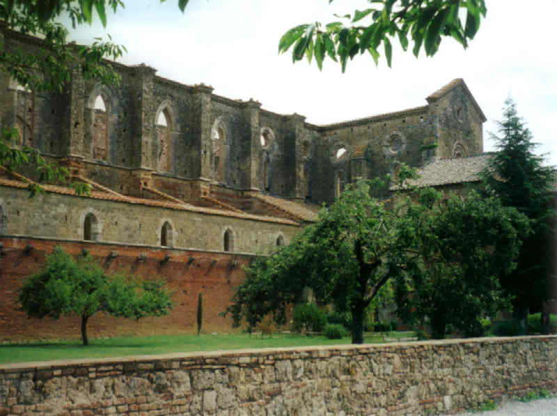 Between Lucignano and Lucca, we visited the abbey at San Galgano. It is now missing its roof, but is still used at times. The aisle had flower petals from a wedding the previous day. |