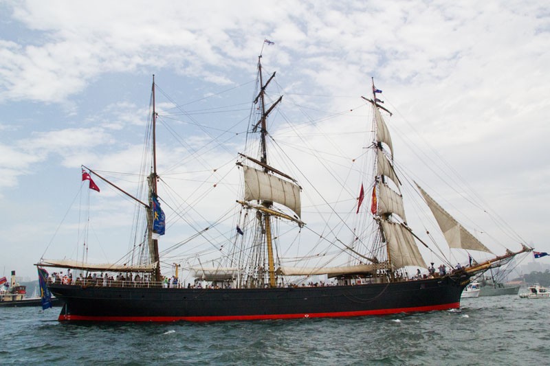 The James Craig, an iron-hulled sailing ship that was used in the 1850s between England and Australia. † |