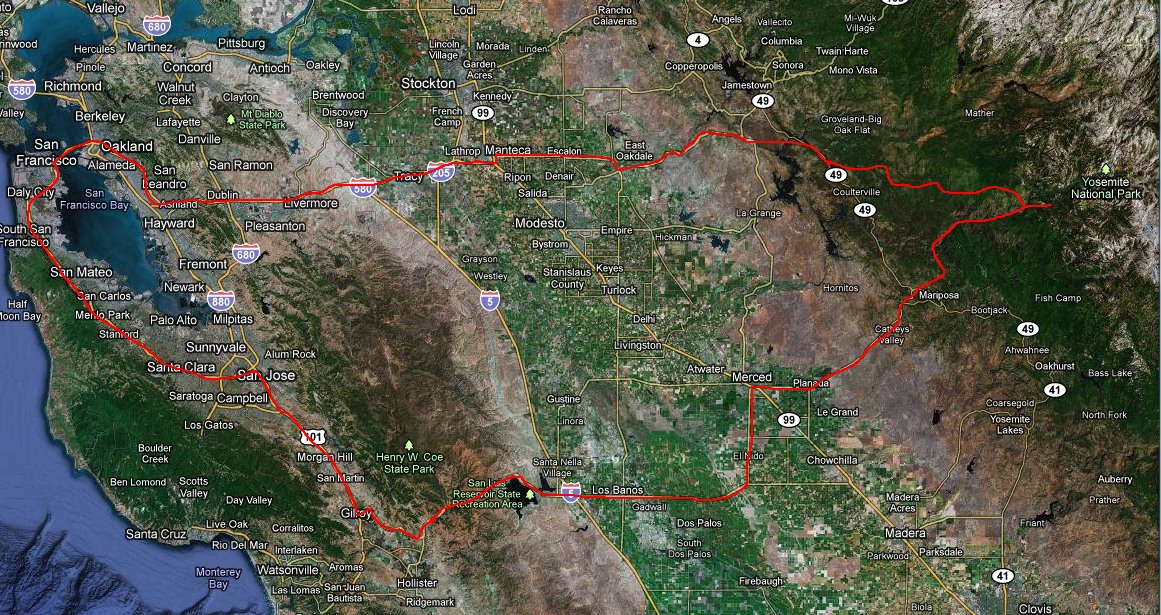 We arrived in San Francisco mid-morning, after a 13-hour flight across the Pacific, and left our luggage at our hotel. Then took a tour of Alcatraz that afternoon. The next morning, we picked up a rental car and drove South past San Jose, then east to Yosemite National Park. After two nights there, we drove back along a more direct route and then had two more nights in San Francisco. We start at Yosemite.