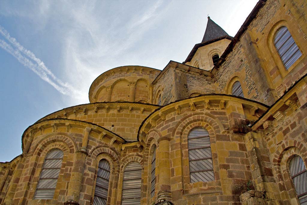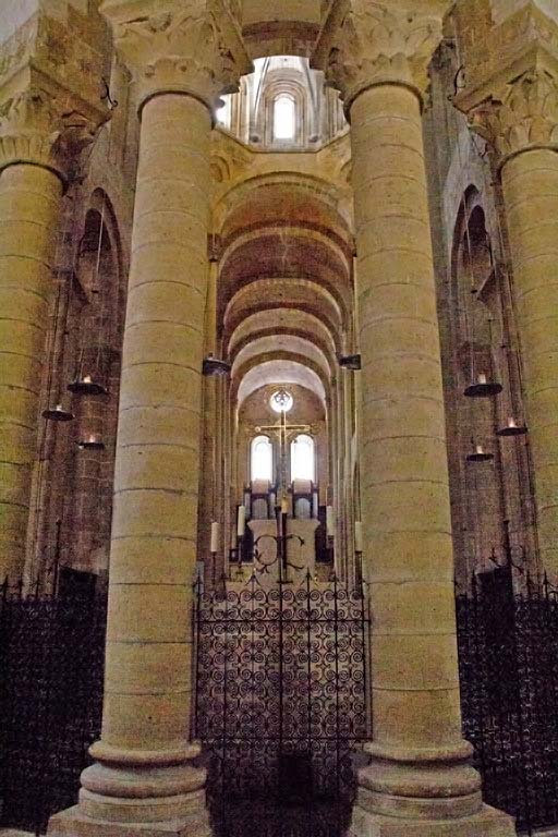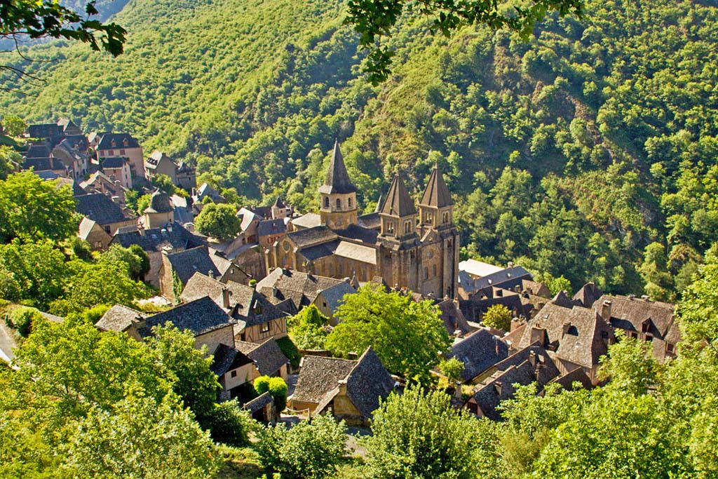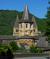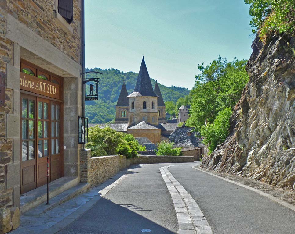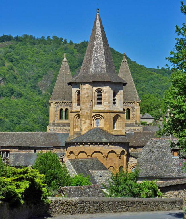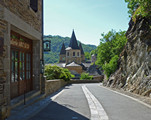Conques is a tiny town clustered around a large abbey church, a stop on the pilgrim route to Santiago. There are still monks here, and you can see "pelerins" in the streets with cockle-shells on their backpacks. * |