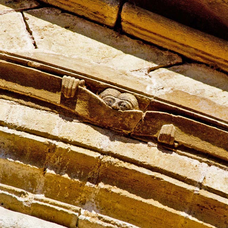 Around the edge of it are these little heads, looking down with hands grasping the frieze. * |