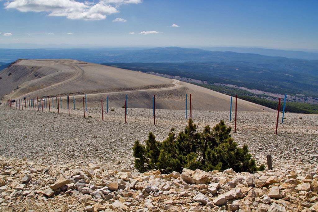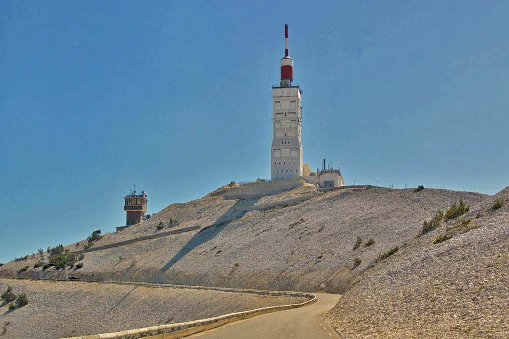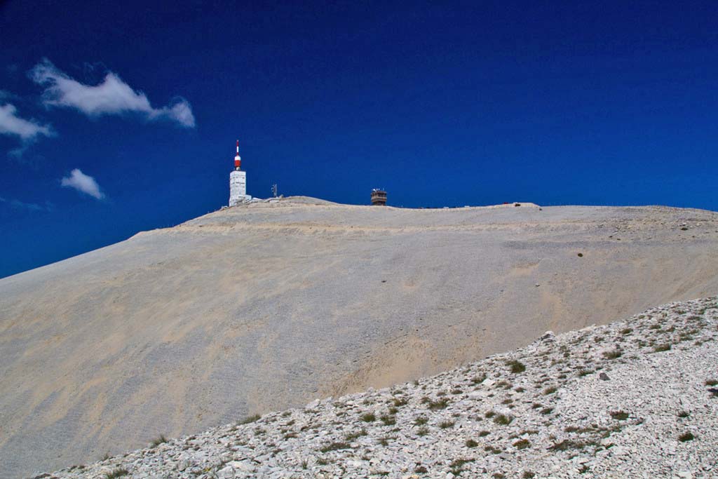 | Mount Ventoux dominates north-western Provence, rising to some 1900 metres. There are three routes to the top, all steep and winding. It is often used as a stage in the Tour de France, and there were plenty of cyclists in May. We drove up from Malaucène in the west, then down eastwards to Sault, where we had lunch, returning along the Gorges de la Nesque. |