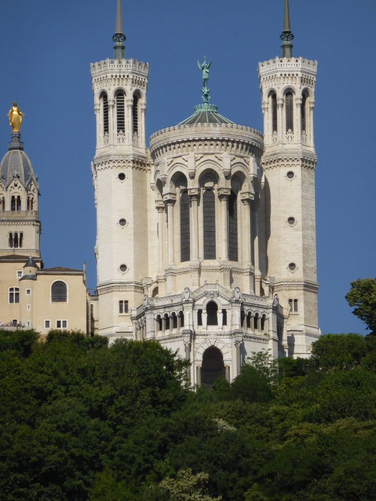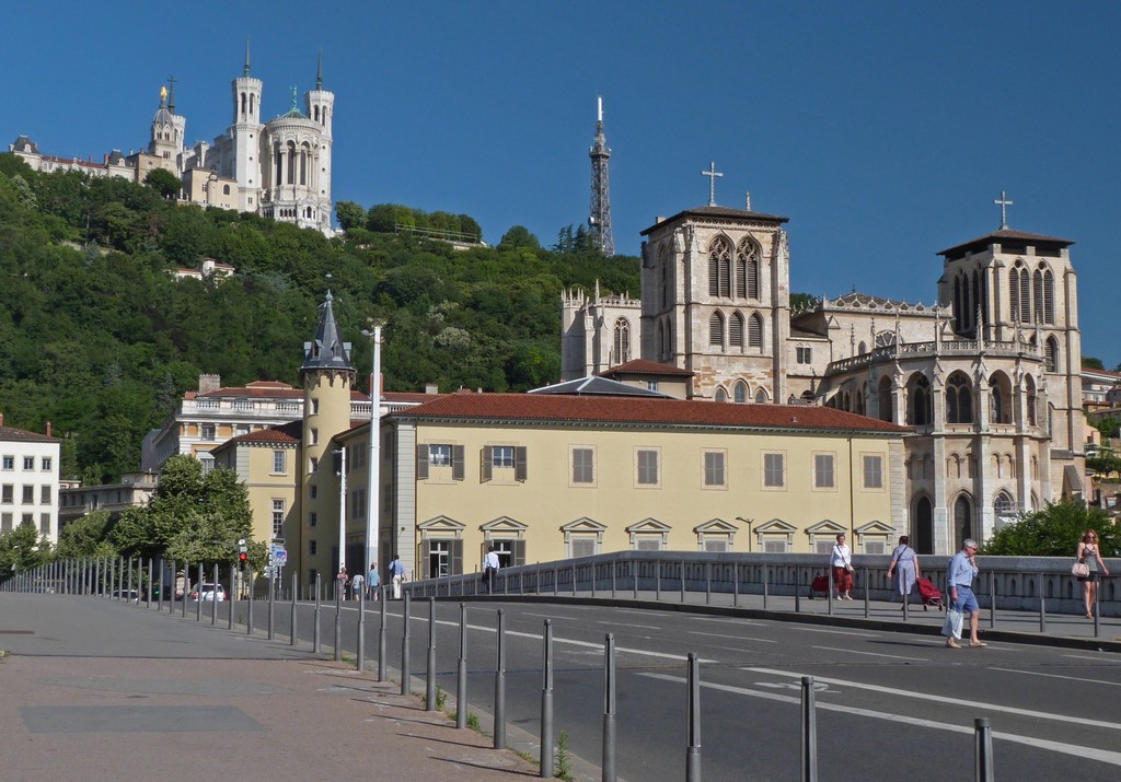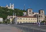 We went over Pont Bonaparte to the old city, with Cathédrale St-Jean on the right and the Basilica of Notre-Dame de Fourvière on top of the hill. † |