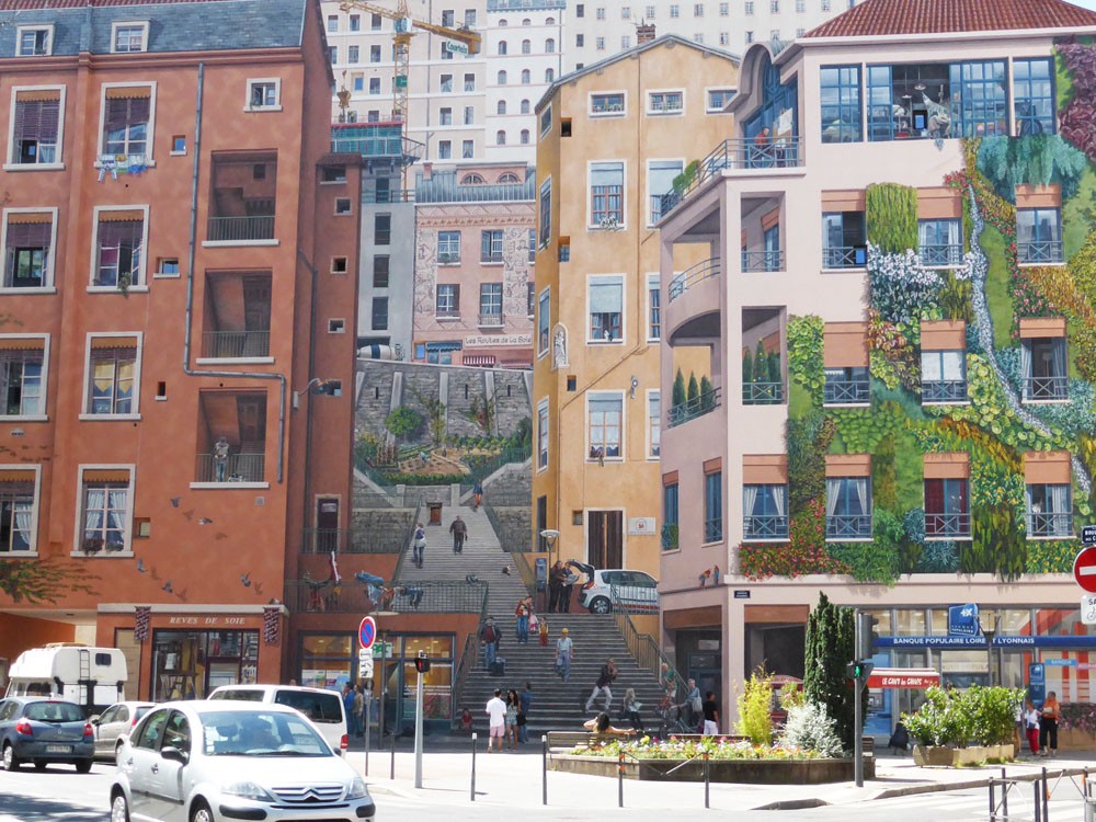 Then on to the Croix-Rousse area, where there was this extraordinary trompe d’oeil on Maison des Canuts. * |