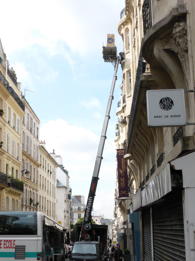 Then back to the apartment, on the way observing a home removal, Paris style. In many buildings, the stairs are too narrow and winding to take large furniture, so it goes up on a hoist and in through a window. * |