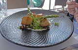 Nick's pan seared scallops with cauliflower purée, asparagus, chorizo and pea salsa. * |