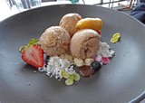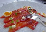 We each had an entrée and a dessert, and they were excellent. This is Lynn's entrée of beetroot and vodka cured Atlantic salmon gravlax, with quail eggs, truffle mayo and avruga caviar. * |