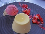 Lynn's dessert: honey pannacotta with frozen guava meringue and strawberry sherbert. * |