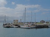 Anchored ships, and the small lighthouse by the harbour entrance. * |