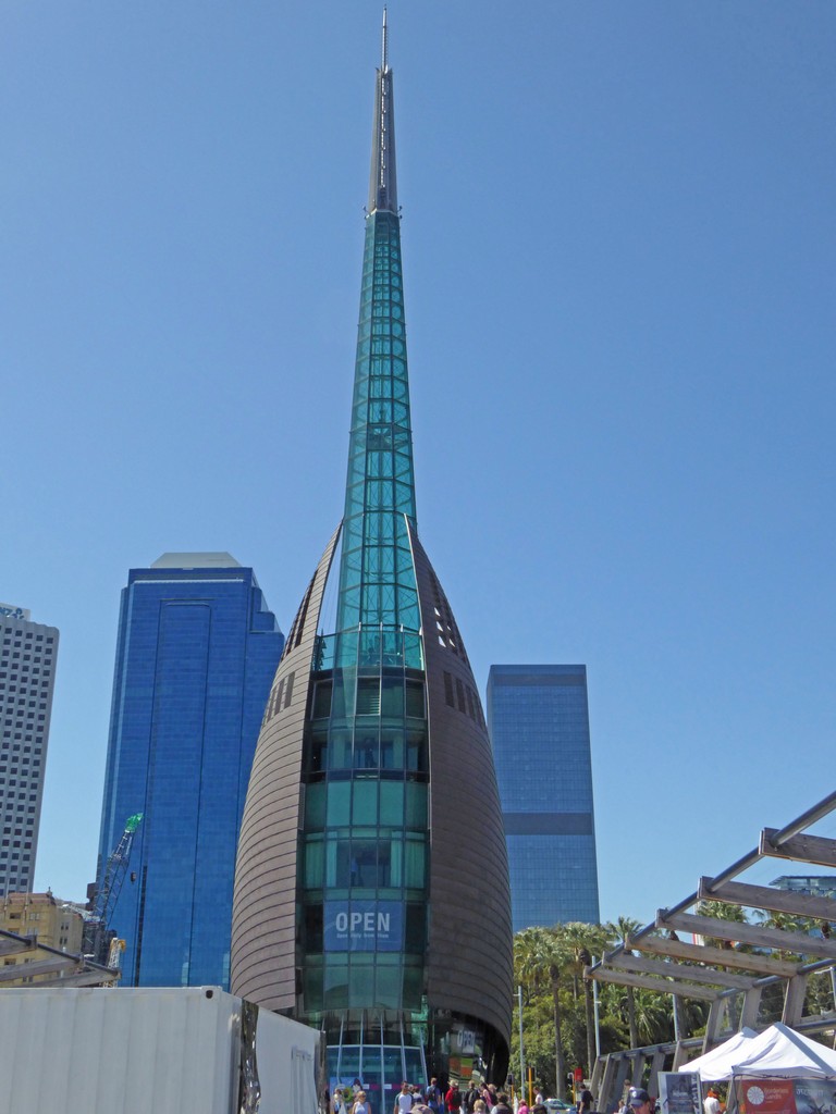 Then by two free buses to Barrack Street Wharf, where this Bell Tower was built in 2000. It contains bells from St Martin in the Fields in London, a gift from the Queen. * |